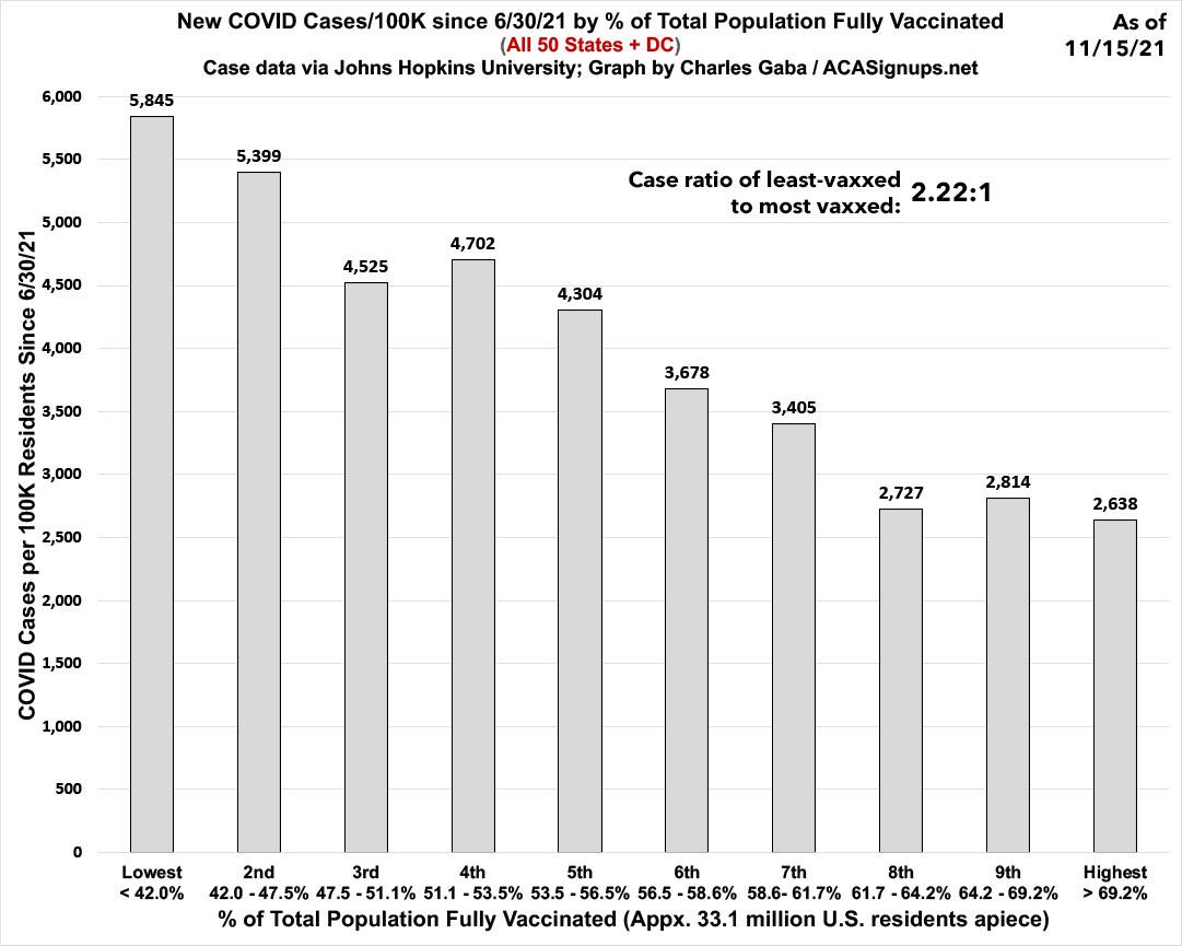 As you can see, case rates since June are 2.22x higher in the least-vaccinated tenth of the country than in the most-vaccinated tenth...identical to a week ago: