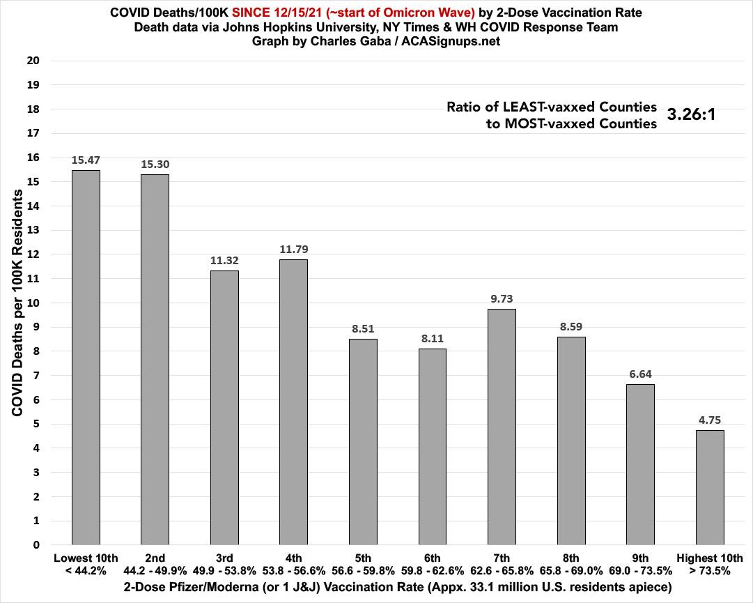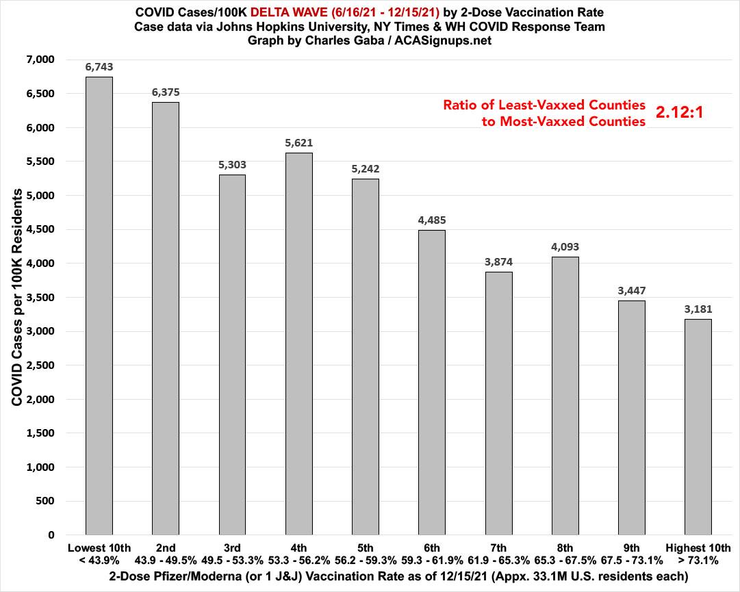 Here's the same data from a NONPARTISAN view: This is based purely on 2-dose vaccination rates (as of 12/15/21). Case rates in the least-vaccinated tenth of the U.S. ran 2.1x higher than in the most-vaccinated tenth, while death rates ran nearly 4.8x higher: