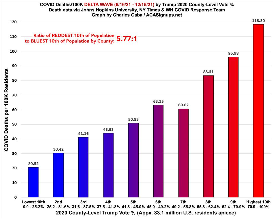 FIRST, here's my final Delta wave graphs, which run from June 15th, 2021 - December 15, 2021. For that period of time, new COVID-19 case rates ran 2.46x higher in the reddest tenth of the U.S. than the bluest tenth...while COVID-19 death rates ran 5.77x higher: