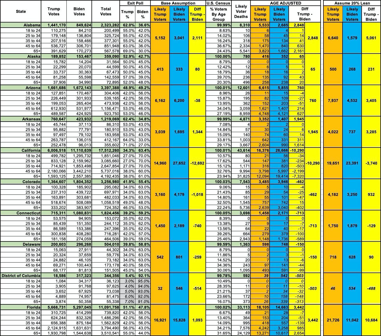 - Finally, the "Assume 20% Lean" columns attempt to account for the other factors I mentioned earlier: Misreported COVID deaths by MAGA coroners, the impact of refusal to wear masks/socially distance and so forth. Assuming this is reasonably accurate, it adds up to around 118,000 more Trump voters (roughly a 135,000 swing from popular vote expection).