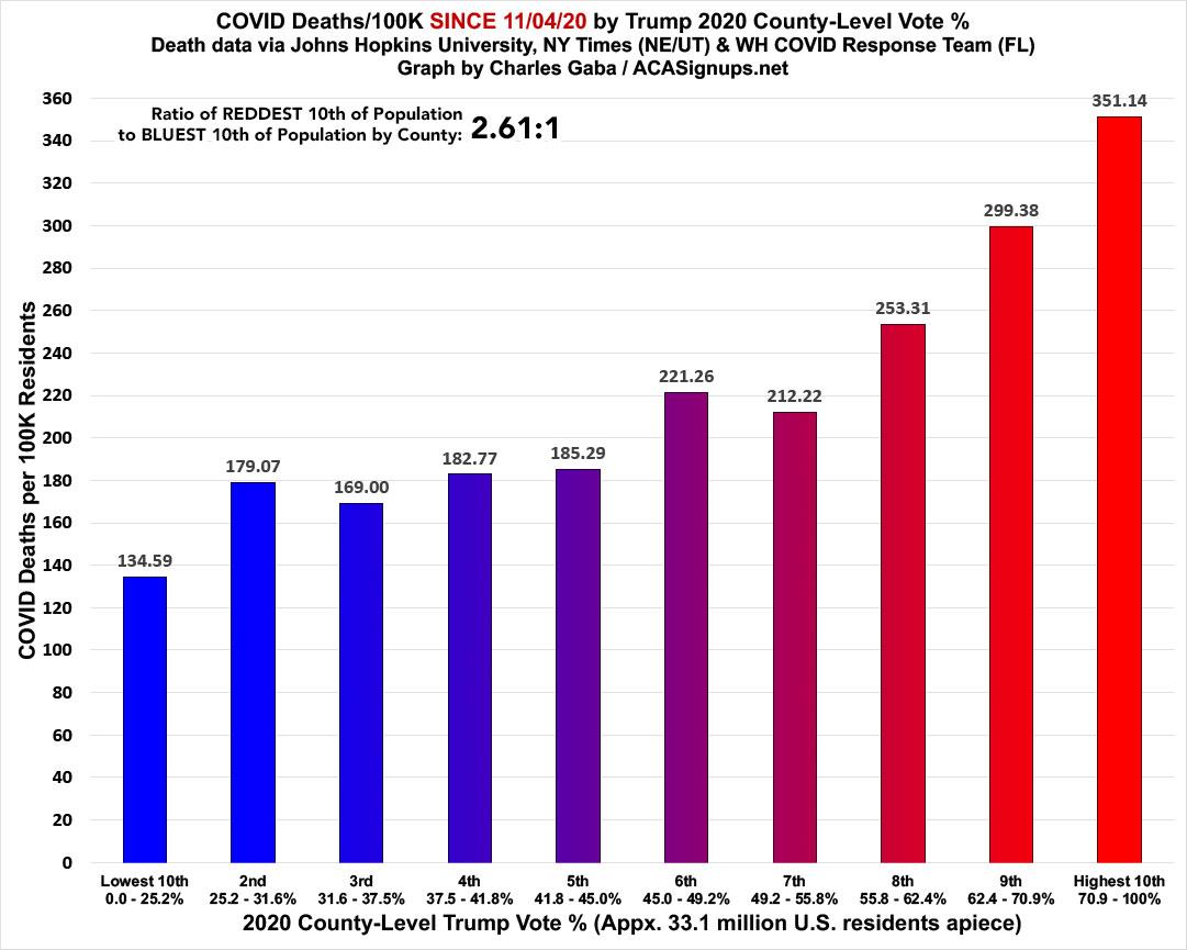 In fact, as of a few days ago, COVID deaths since the 2020 Election were running 2.6x higher in the reddest tenth of the country than the bluest tenth.