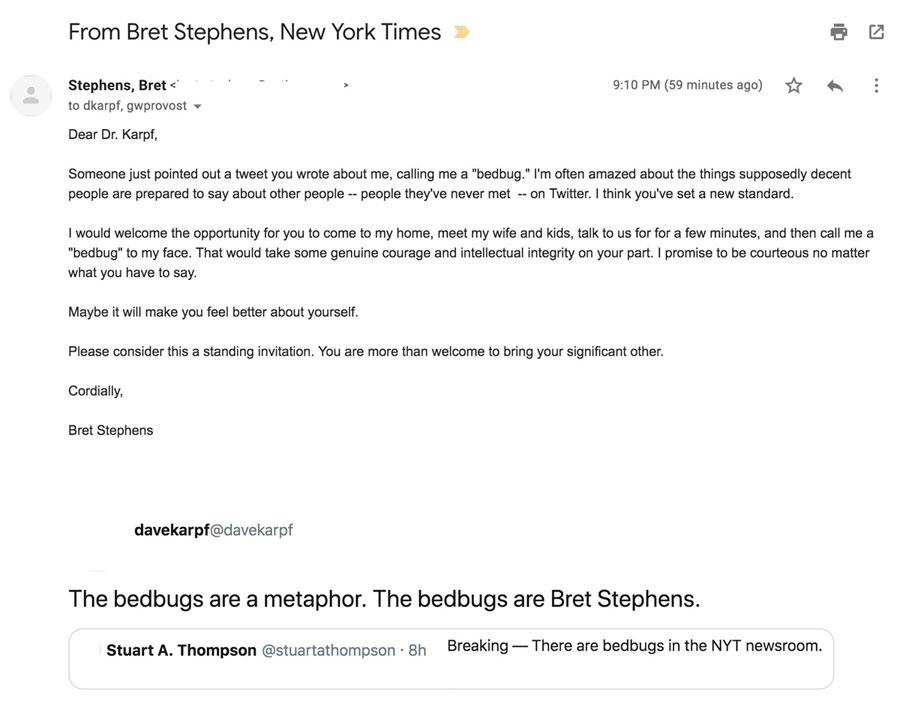 He called the Karpf’s bedbugs tweet “dehumanizing and totally unacceptable” and said he invited Karpf to his home to see if the professor would call him a bedbug to his face — because, Stephens said, “a lot of things people say on social media aren’t the things they’re really prepared to say in one-on-one interactions.”
