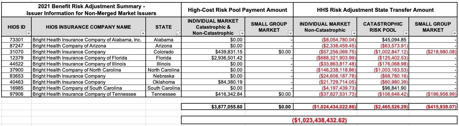 In any event, I downloaded the 2021 Benefit Risk Adjustment Summary report...specifically the appendix which breaks the data out by issuer...and voila: