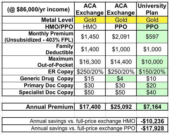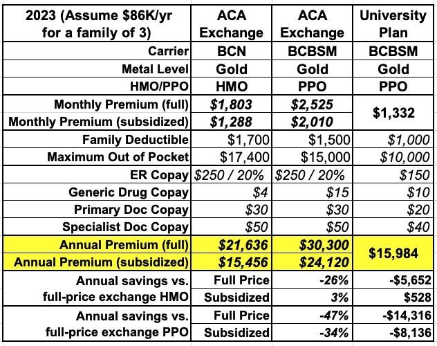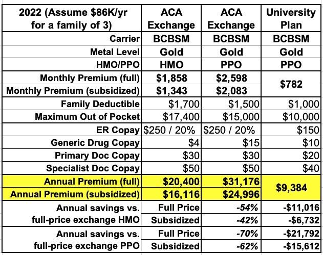 The plan being offered to all students (including graduate students and their families) was a Gold PPO through Blue Cross Blue Shield of Michigan. Here's how it compared against the closest equivalent policies available on the ACA exchange at the time, assuming we didn't qualify for any ACA subsidies (remember, this was before the American Rescue Plan beefed up & enhanced the subsidies to those earning more than 400% of the Federal Poverty Level):