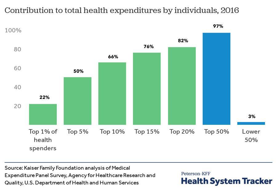 In short, around 22% of all healthcare spending goes to cover the expenses of just 1% of the population. Half of all spending goes to cover around 5% of the population, and so on. Fully 97% of all healthcare spending goes to treat just half the population, while the other half typically racks up only nominal amounts (annual checkups, preventative care and the like).