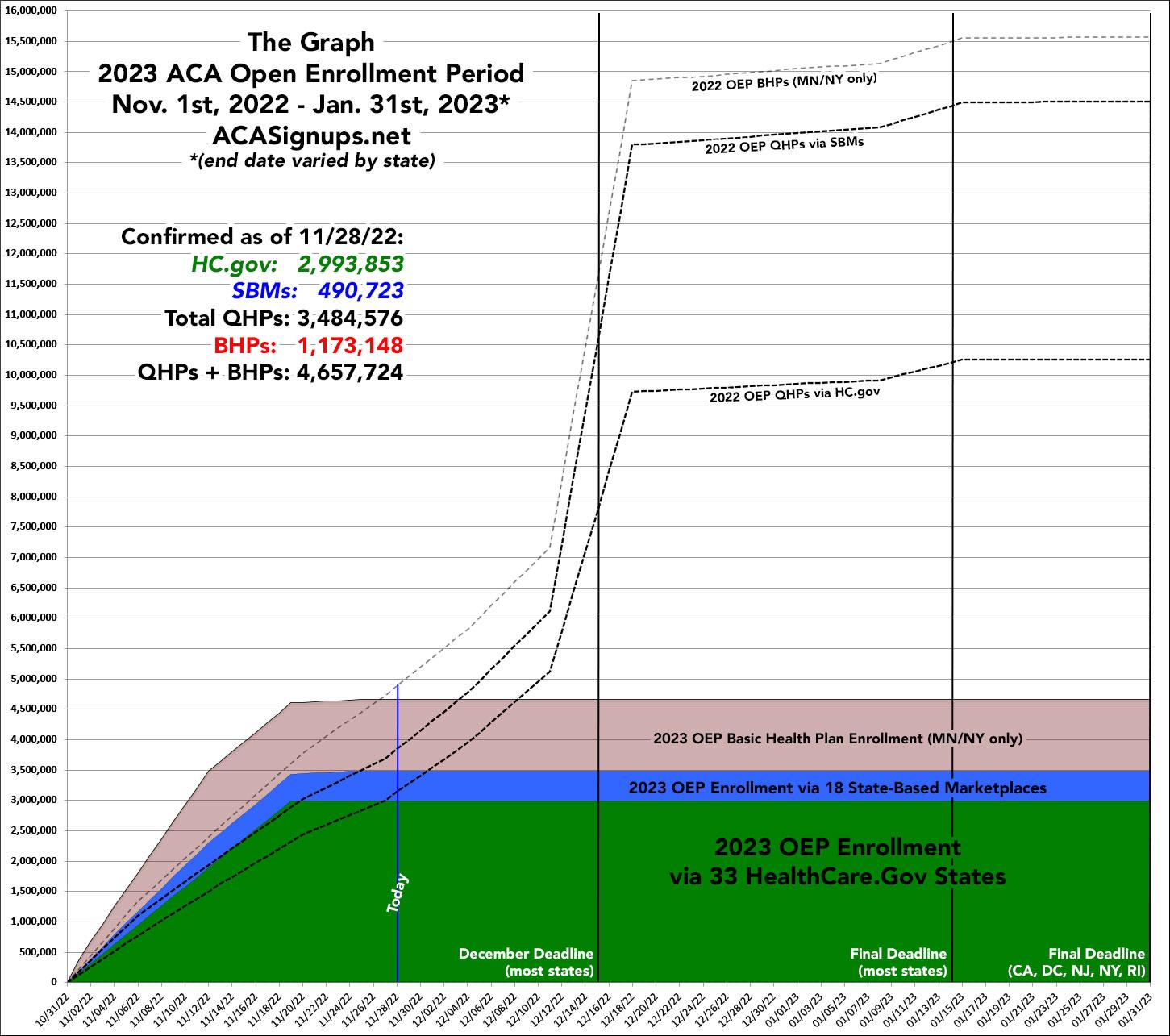 Last week I noted that the Centers for Medicare & Medicaid Services (CMS) finally released their first 2023 Open Enrollment Period report, which included 3.0 million Qualified Health Plan (QHP) enrollees through 11/19/22 for the 33 states hosted by HealthCare.Gov plus another 387,000 QHP enrollees via the 18 state-based ACA exchanges.