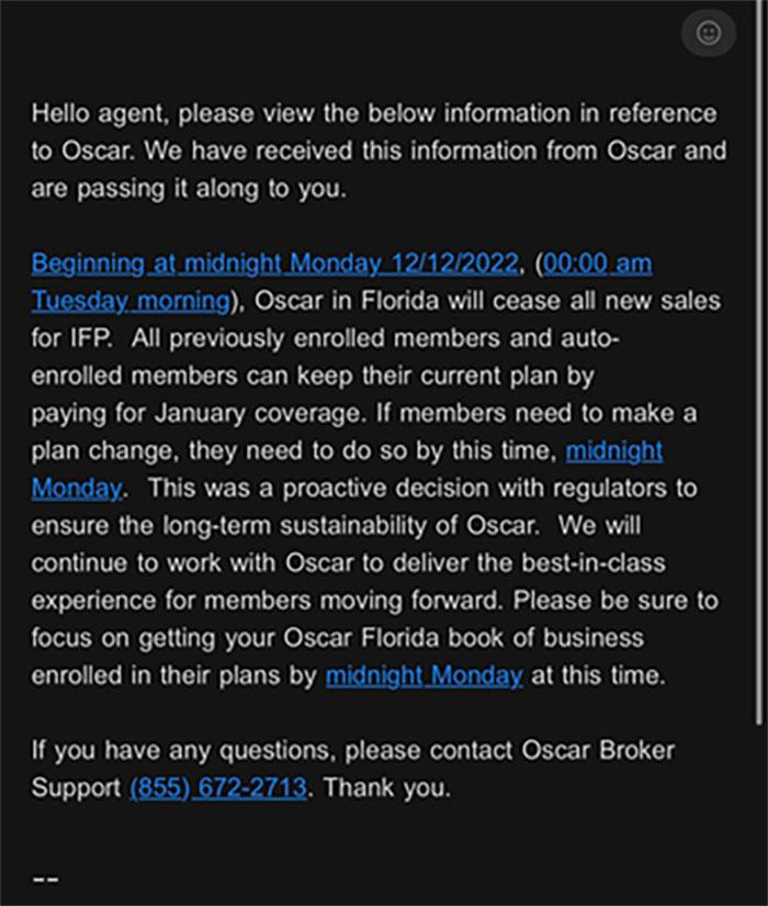 UPDATE: Good grief: This is another email directly from Oscar itself to Florida-based brokers which sell their policies: