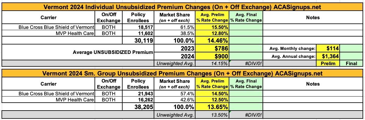 For 2024, the first state I have preliminary rate filings available for is VERMONT. Vermont's filings are pretty easy to average because a) they don't redact any of their filing data; b) they make the forms easy to access; and c) they only have two insurance carriers operating in the individual or small group markets anyway (in fact, it's the same two carriers in both markets).