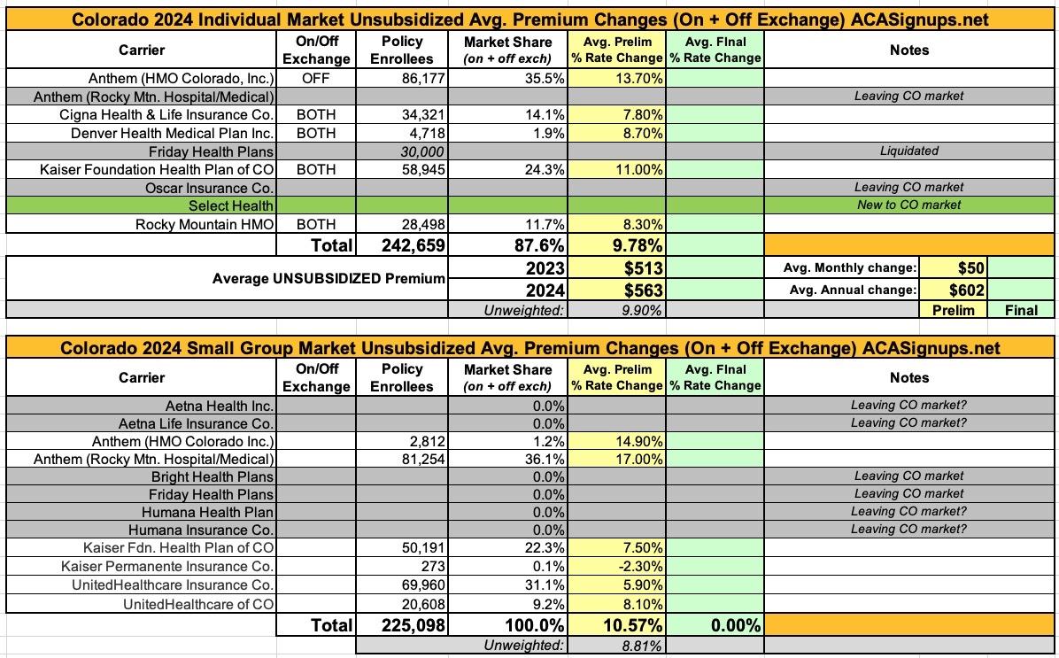 Colorado: Preliminary avg. unsubsidized 2024 #ACA rate changes: +9.8%