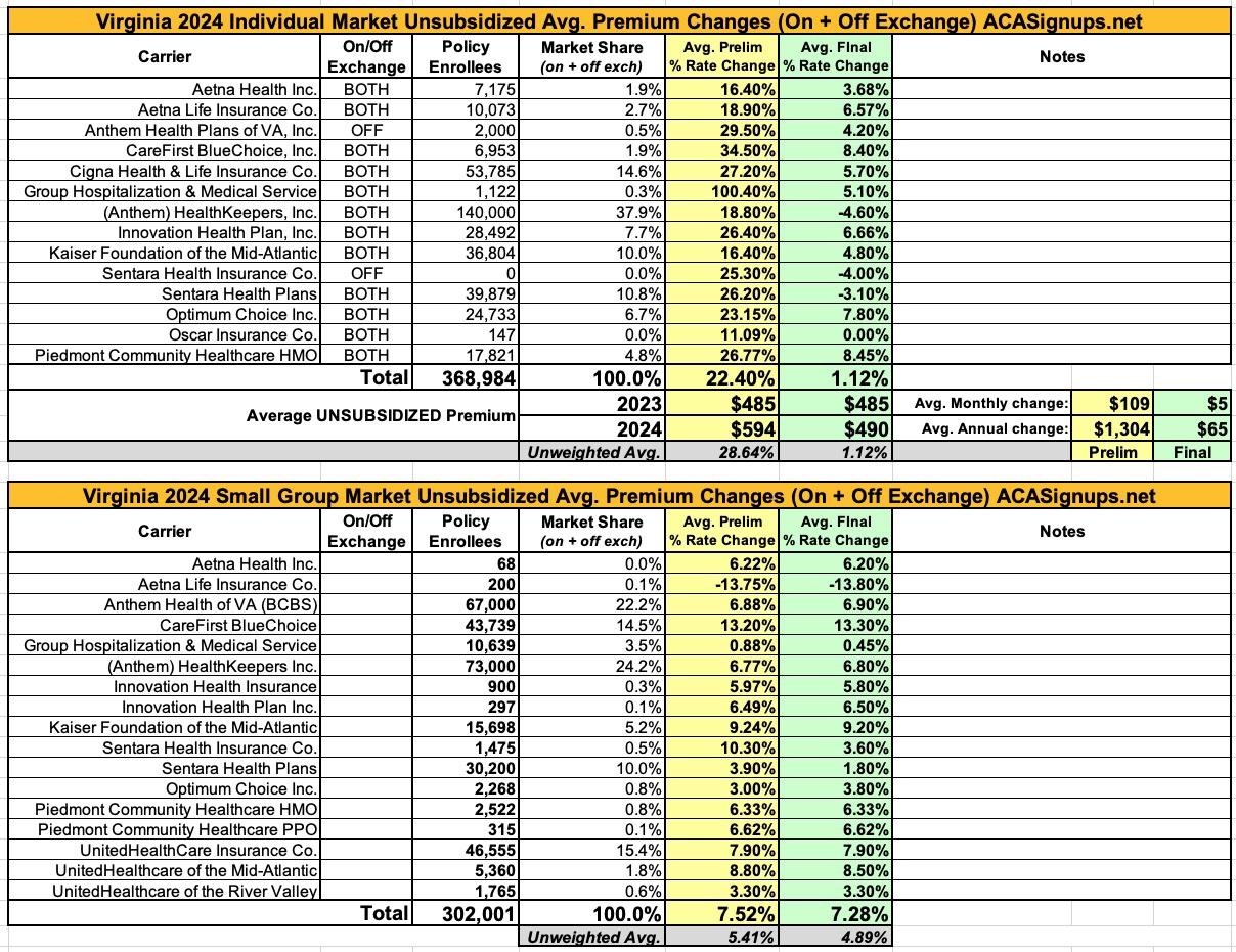 As I noted a month ago, Virginia insurance carriers participating in the ACA individual market submitted preliminary 2024 rate filings which averaged over a 20% hike, almost entirely due to the prospect of the states reinsurance program (which had only been implemented one year earlier) possibly not being funded for the second year.