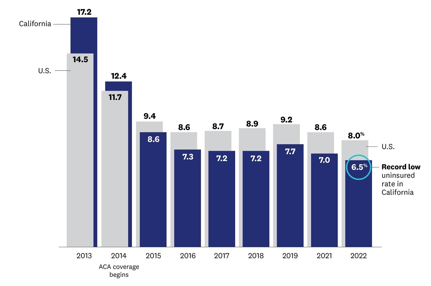 Open enrollment begins with a record-low uninsured rate of 6.5 percent among Californians, according to federal data. Since Covered California’s first open-enrollment period in 2013, California’s uninsured rate has fallen from 17.2 percent to 6.5 percent in 2022, which is the largest percentage point drop for any state in the nation over this time.