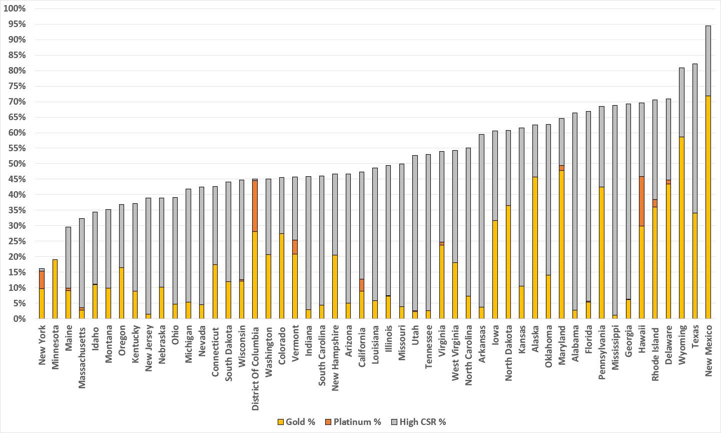 With this in mind, I decided to figure out just what percent of ACA enrollees in each state have "Gold or Better" coverage. This includes enrollees with actual Gold or Platinum plans along with those in high-CSR Silver plans (ie, not including the nominal 73% AV population).