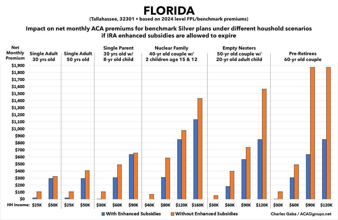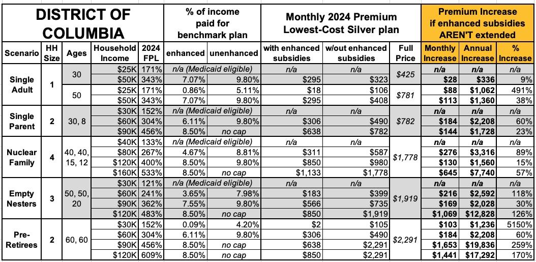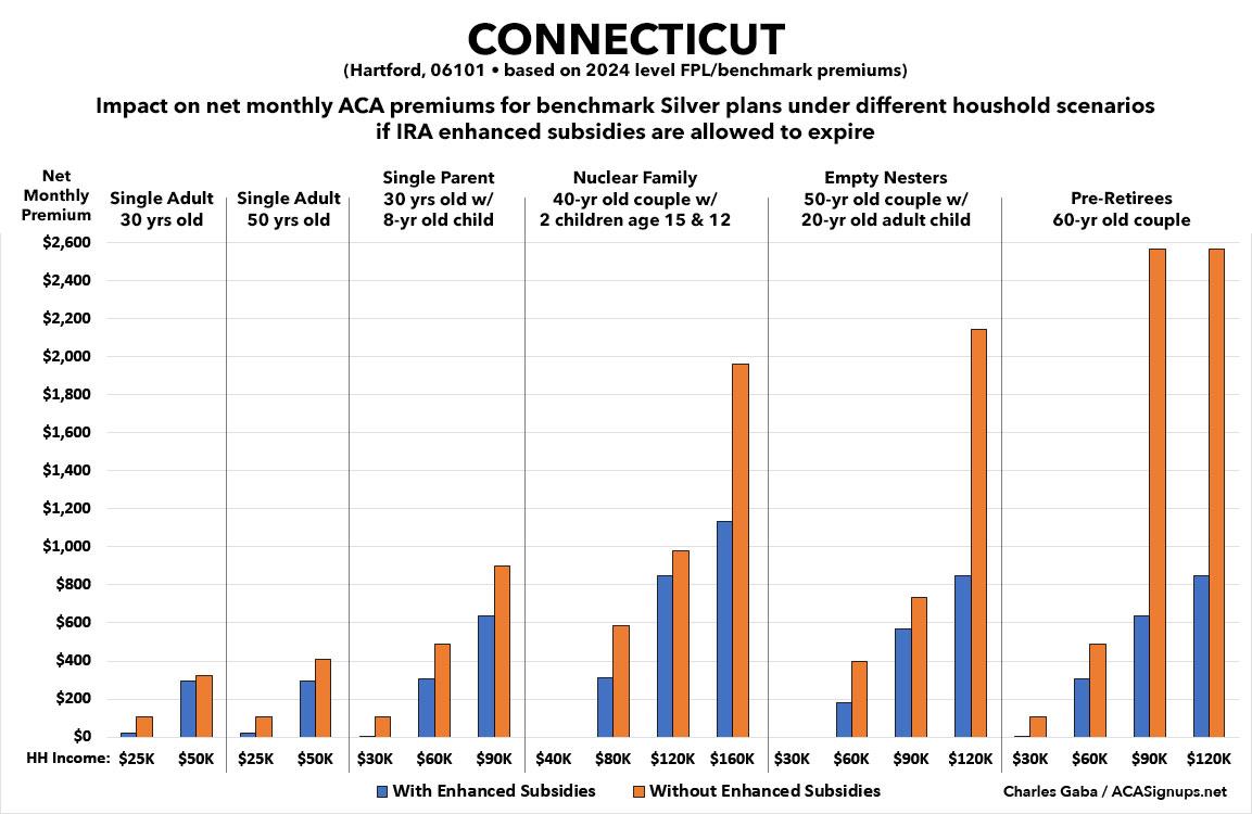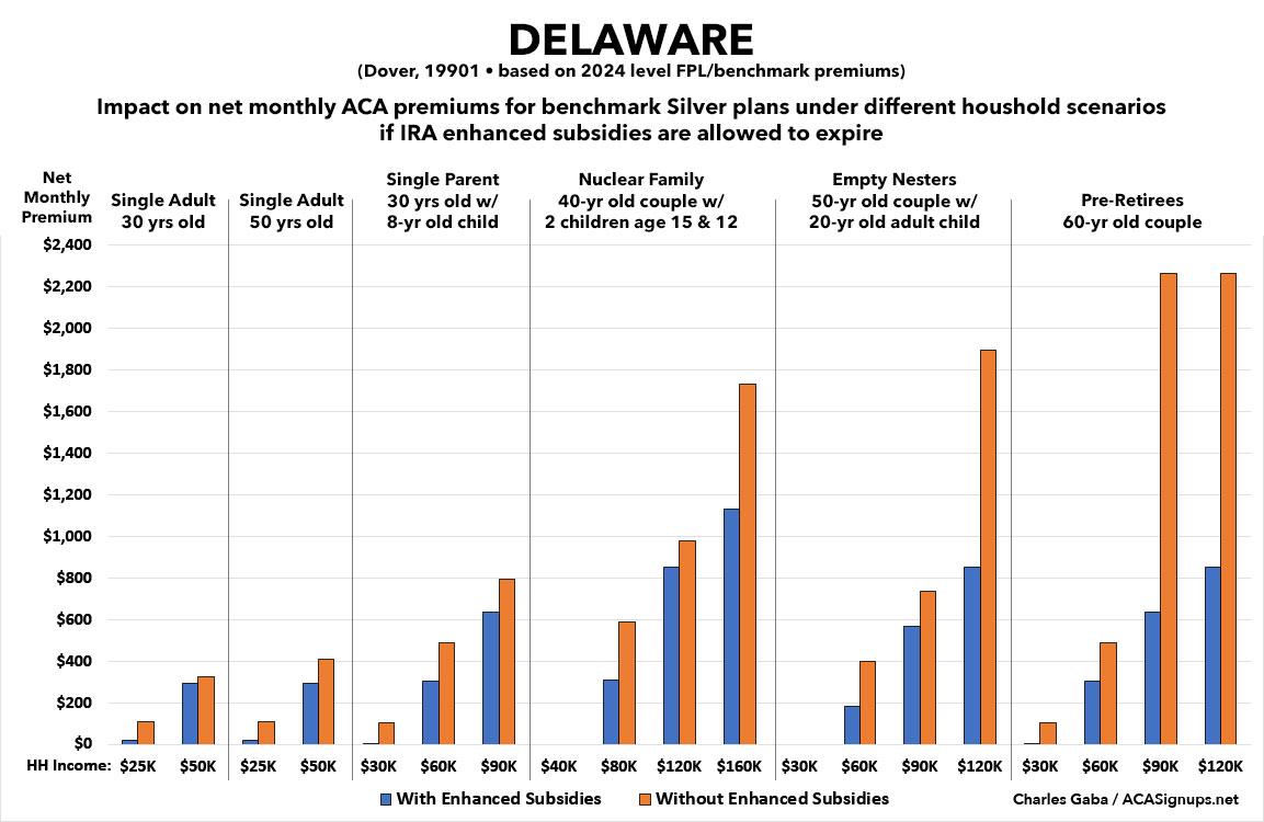 That's the macro level, however. As I did a couple of years ago when the subsidies were originally at risk of expiring in 2023, I decided to run the numbers myself to get an idea of just how much enrollees real-world health insurance premiums would go up in the event the ARPA/IRA subsidies are indeed allowed to expire at the end of next year.
