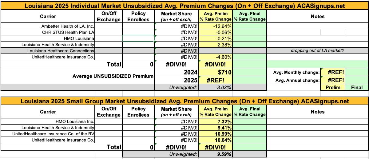 Louisiana: Preliminary avg. unsubsidized 2025 #ACA rate changes: -3.0% (unweighted)