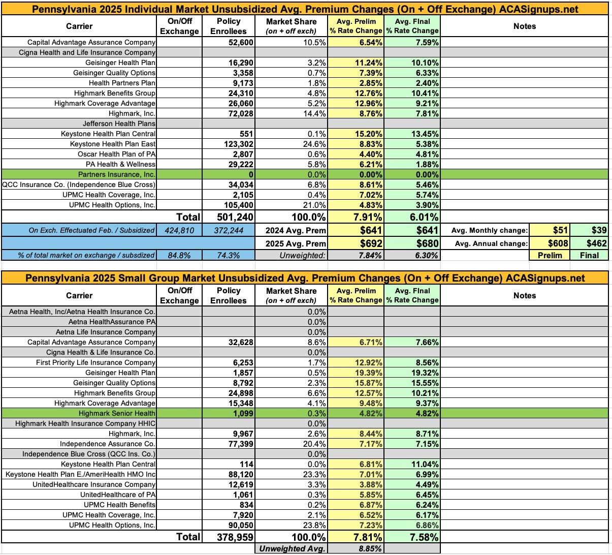 Pennsylvania: *Final* avg. unsubsidized 2025 #ACA rate changes: +6.0%; several carriers leaving/joining (updated)