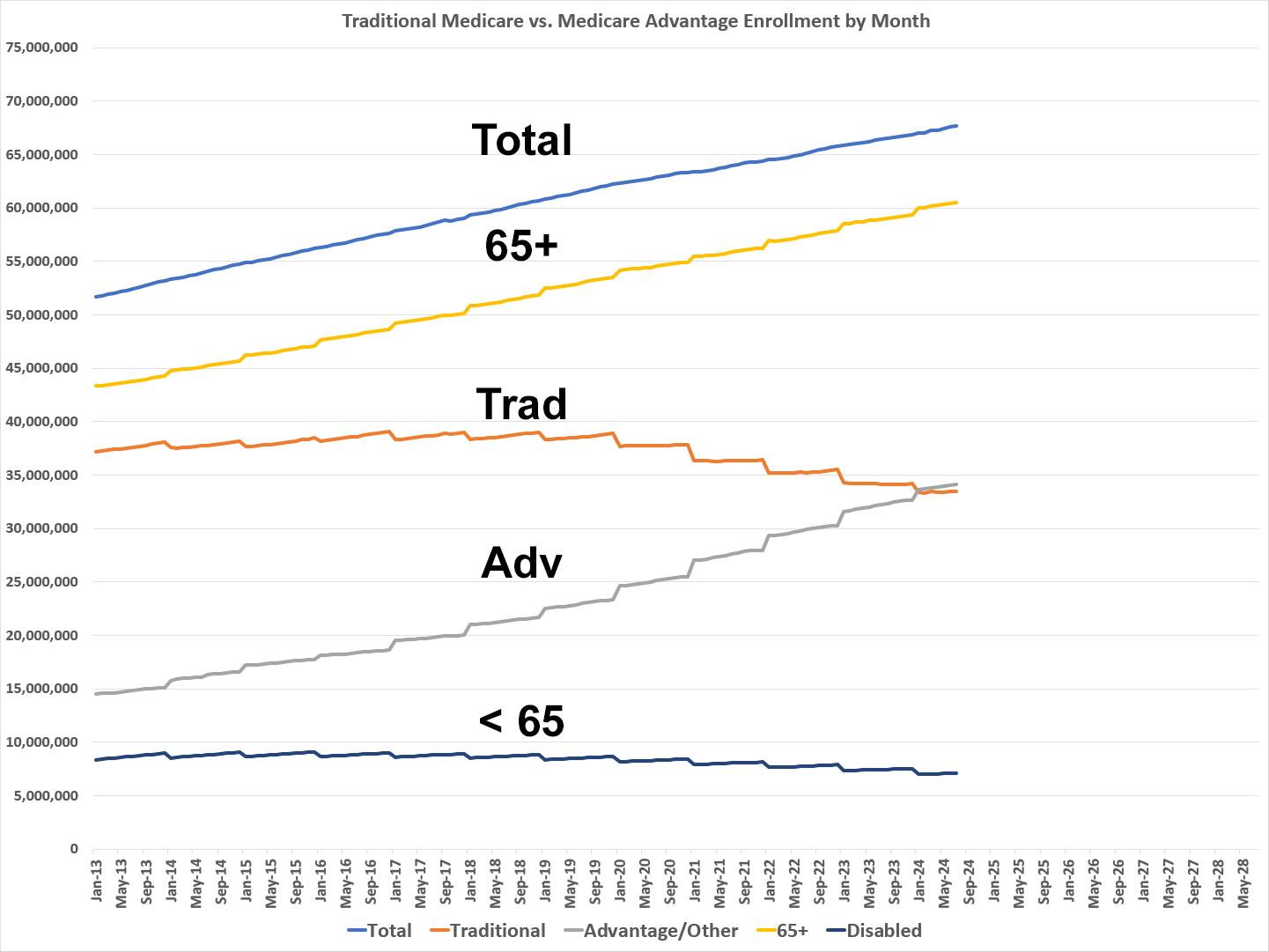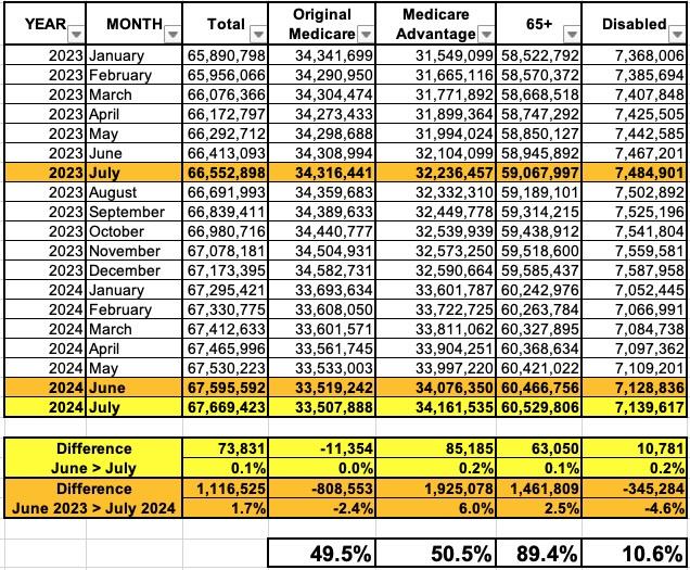 • Total Medicare beneficiaries reached 67,669,423...up 73,831 from June.