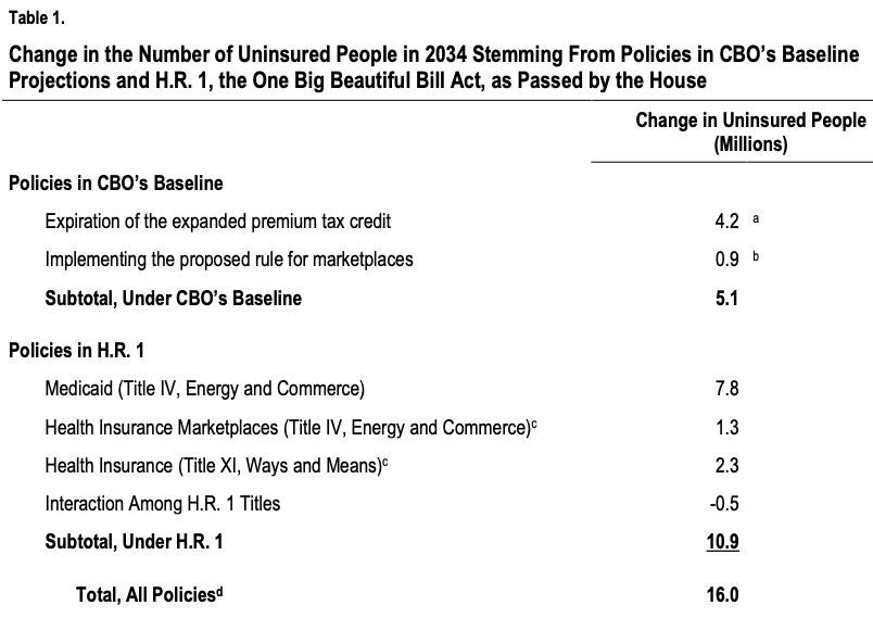The Congressional Budget Office has published several projections about how many people would lose healthcare coverage and/or become uninsured (these aren't the same thing) under various versions of the #OneBigUglyBill Act passed by House Republicans, which is currently beginning its next phase over on the Senate side of the Capitol.