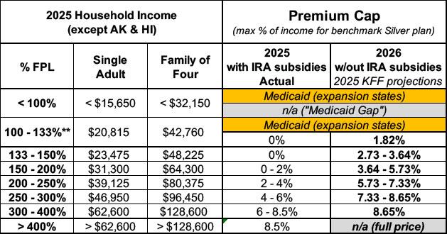 If the IRA subsidies expire, however, there are three things which change: First, that last row for enrollees earning more than 400% FPL goes away--they have to go back to paying full price. This is called the "Subsidy Cliff" and I've talked about it many times before.