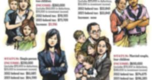 Even worse: Adjusted for inflation, the single parent would be earning $365,000 today; the young adult would earn $323,000; the retired couple $253,000; and the couple with kids would earn a whopping $914,000 in 2025 dollars.