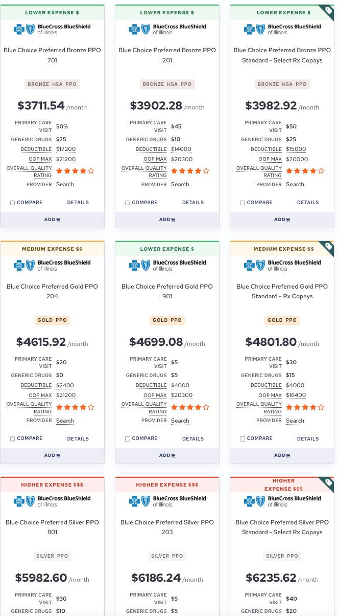 When you skip past the next few screens to see the actual plan options, you'll see the same nine plans from BCBSIL (3 Bronze, 3 Silver, 3 Gold)...except that now they're all listed at full price...which ranges from $3,712/month for the least-expensive Bronze to an absolutely eye-popping $6,236/month for the most-expensive Silver plan.