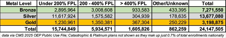 The bottom line is that Silver Loading ended up making lemons into lemonade: Over 5.7 million moderate-income enrollees who earn over 200% FPL and are enrolled in Bronze, Gold or Premium plans are greatly benefiting from this pricing strategy right now via dramatically lower premiums.