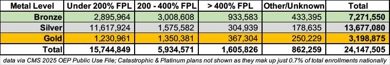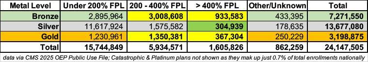 Here's a breakout of 2025 ACA exchange enrollment by metal level and income bracket...