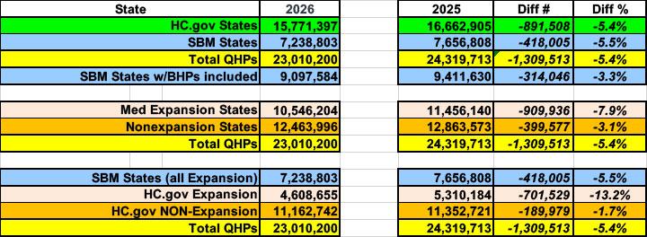 The total of the state by state breakout below is around 37,000 higher than the 2026 summary total above due to my having more recent enrollment data for 9 of the SBM states (CA, CO, CT, ME, MD, MA, NV, NM & WA). I've included columns to note how many days of enrollment data are still missing for 13 of the SBM states:
