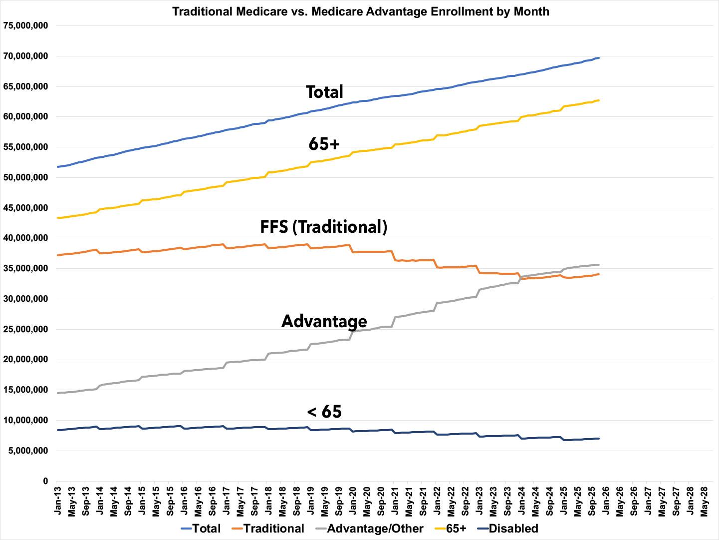 The Centers for Medicare & Medicaid Services just published updated enrollment data for Medicare, adding November 2025 to the data archive.