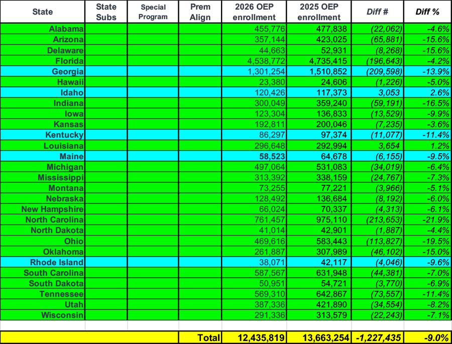 ...I don't have the month-over-month percent drop displayed in the table this time, but from January - February 2026 effectuated enrollments dropped 3.7%, compared to a 4.1% increase month over month in 2025. Whoa.