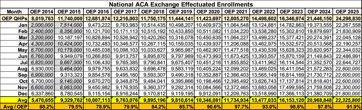 During the ePTC years, average effectuated enrollment has grown dramatically each year, from ~11.7 million in 2021 all the way up to ~22.4 million in 2025.