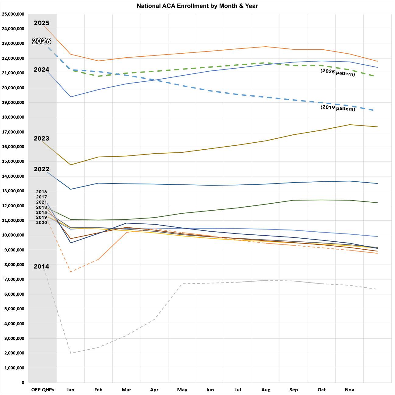 In the graph, the thick dotted blue & red lines show what effectuated enrollment would look like over the course of 2026 assuming it follows either the pattern from last year (2025) or the pattern from 2019.
