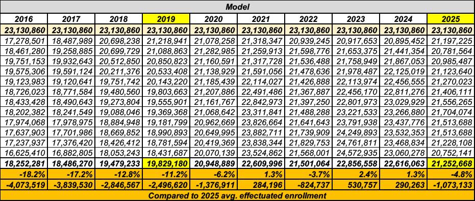 OK, so what about 2026? Well, again, back in January I plugged in what effectuated enrollment would look like in 2026 assuming it follows the same pattern as prior years. In addition to 2025, the best model to look at is the most-recent year prior to enhanced tax credits being put into place.