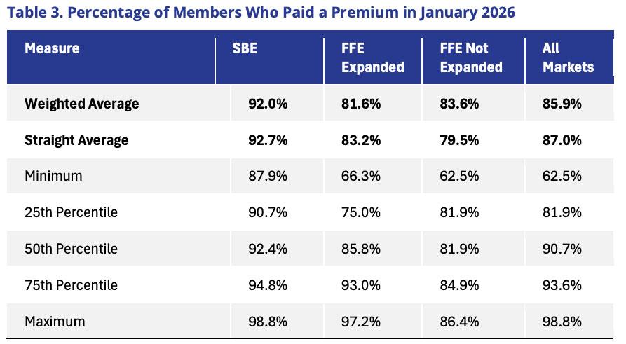 The analysis finds that while initial plan selection data1 suggested only modest declines in enrollment, a deeper look at premium payment behavior tells a more complex story. On average, only 86% of enrollees paid their first premiums in January 2026, with significant variation across states.