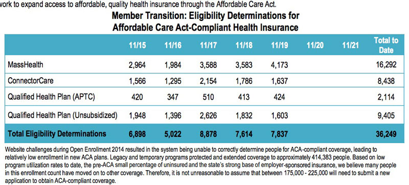 Well, it turns out I had it right in the first place: Massachusetts is about to announce 14,101 QHPs actually selected as of Saturday, out of 28,175 determinations (essentially 50% on the nose)!