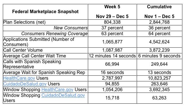 With the December 15th deadline just 1 week away and the December Surge starting to kick in, CMS decided to hold a full press conference call this morning ahead of the Week 5 HC.gov Snapshot report.