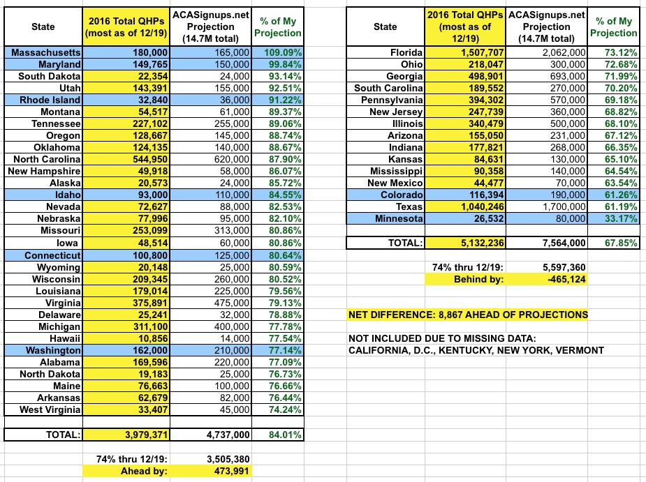 In addition, while these won't impact the federal exchange numbers, several state-based exchanges (Maryland, Massachusetts, Minnesota, New York, Rhode Island and Washington State) have/had January deadlines later than the 12/17 one on the federal exchange and some other states, so there's a lot of bumpy numbers going into Week Eight.