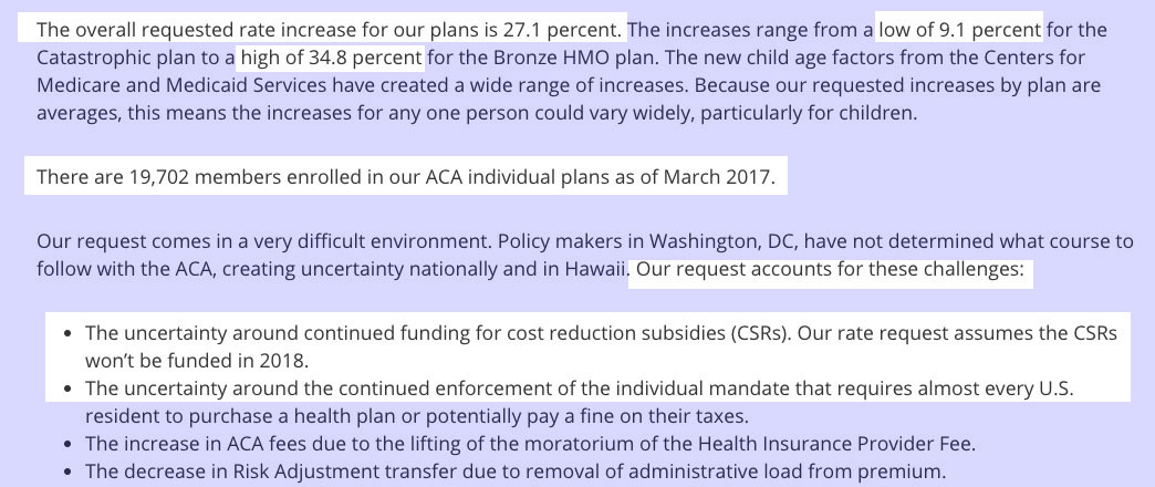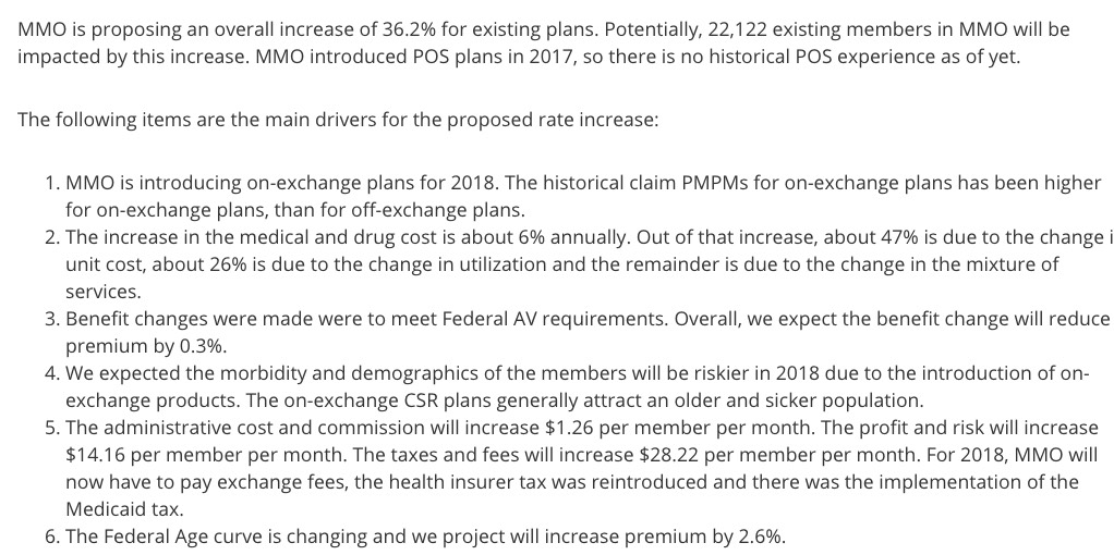 Interestingly, while Medica's rate filing letter clearly states that the 16.9% request assumes CSR payments will be made and the mandate will be enforced, they also list "unprecedented uncertainty/risk inherent in the marketplace" as one of the key drivers of the increase.
