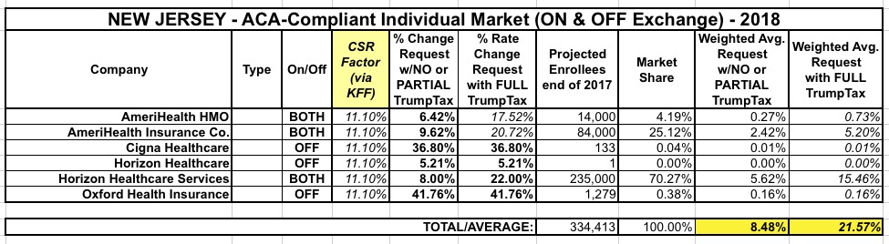 I had already posted a partial look at the New Jersey rate hike situation a couple of weeks ago with a video in which Topher Spiro of the Center for American Progress interviewed NJ Congressman Frank Pallone about the situation. Since his comments weren't official and only referred to Horizon Blue Cross, I didn't make it an official part of the Rate Hike spreadsheet, but now I've managed to plug in the remaining carriers and here's how it looks. As expected, with Horizon holding a commanding 70% market share, the statewide average is around 8.5% if CSR payments are made and the mandate is enforced versus 21.6% if CSR payments aren't made and the mandate isn't enforced.
