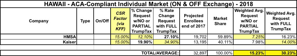 Hawaii only has two carriers on the individual market (and in fact doesn't even have much of an individual market due to a state law mandating that nearly every business provide coverage anyway). HMSA's filing letter is very specific about calling out both the CSR and mandate enforcement sabotage factors as being part of their request. Kaiser doesn't really mention either issue at all, and the only CSR reference in the filing seemed to assume it would be paid, so I have one in each category. Kaiser Family Foundation assumes a 21% Silver CSR rate hike, and 71% of Hawaii's exchange enrollees are on Silver plans, so that amounts to roughly a 15% overall CSR factor.