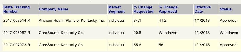 When I ran the requested rate hike numbers for Kentucky in early August, it looked like the only 2 carriers participating in the individual market next year (CareSource and Anthem BCBS) were asking for pretty hefty hikes of around 30.8% on average...and that assumed CSR reimbursement payments would be made next year. If they aren't, based on the Kaiser Family Foundation's estimates, I tacked on an additional 13.8% for a requested average of 44.3%. Ouch.