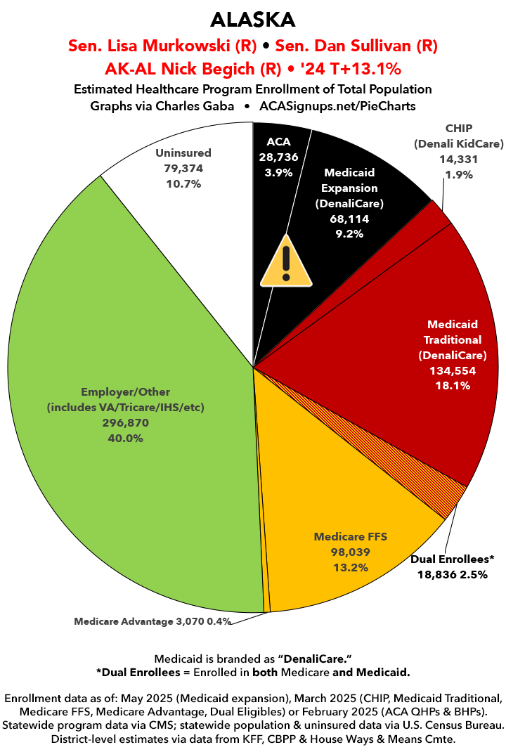 UPDATE 7/1/25: I've updated the web graphic with the most up-to-date enrollment data I have access to. The black sections w/the ⚠️ symbol are those most at risk of losing healthcare coverage due to H.R. 1, the "One Big Beautiful Bill Act" (aka the #MAGAMurderBill).
