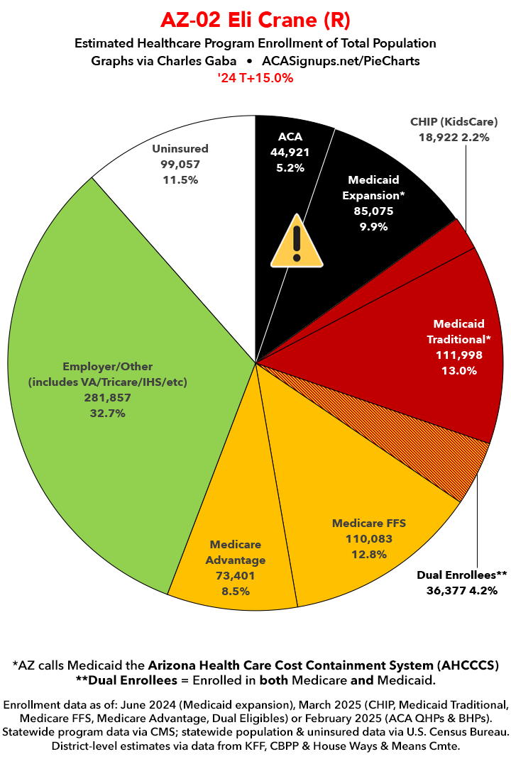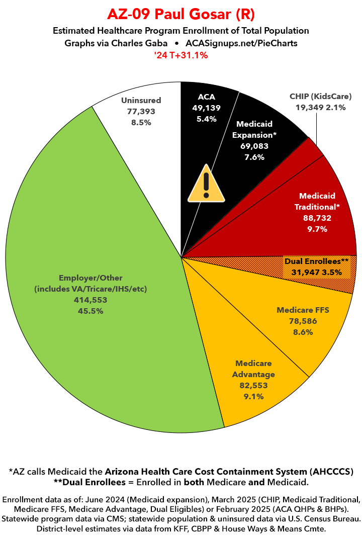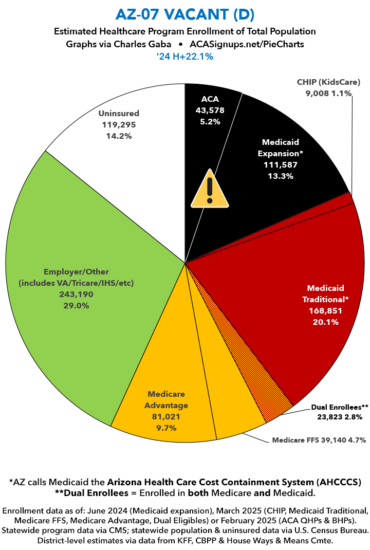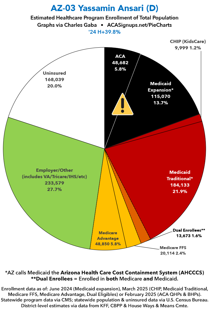 UPDATE 7/1/25: I've updated the web versions of the graphics with the most up-to-date enrollment data I have access to. The black sections w/the ⚠️ symbol are those most at risk of losing healthcare coverage due to H.R. 1, the "One Big Beautiful Bill Act" (aka the #MAGAMurderBill).