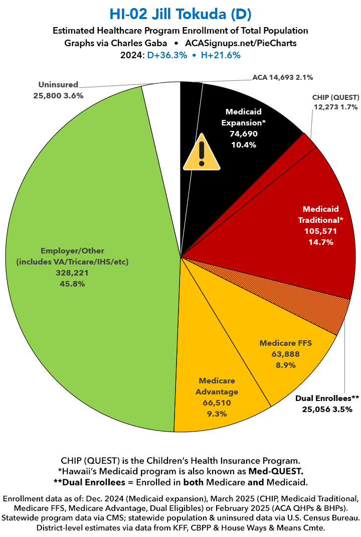 UPDATE 7/16/25: I've updated the web versions of the graphics with the most up-to-date enrollment data I have access to. The black sections w/the ⚠️ symbol are those most at risk of losing healthcare coverage due to H.R. 1, the "One Big Beautiful Bill Act" (aka the #MAGAMurderBill).