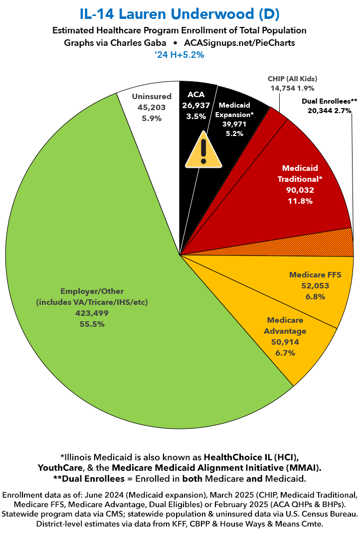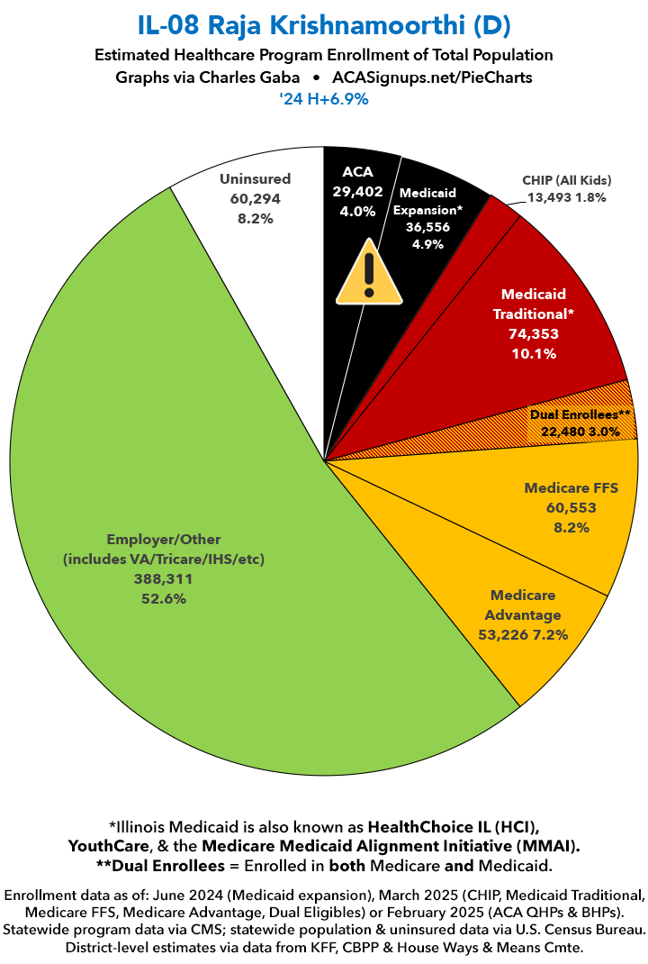 UPDATE 7/3/25: I've updated the web versions of the graphics with the most up-to-date enrollment data I have access to. The black sections w/the ⚠️ symbol are those most at risk of losing healthcare coverage due to H.R. 1, the "One Big Beautiful Bill Act" (aka the #MAGAMurderBill).
