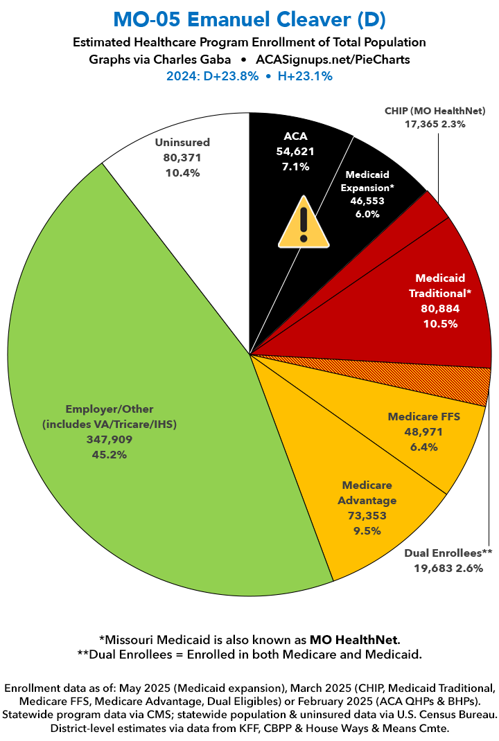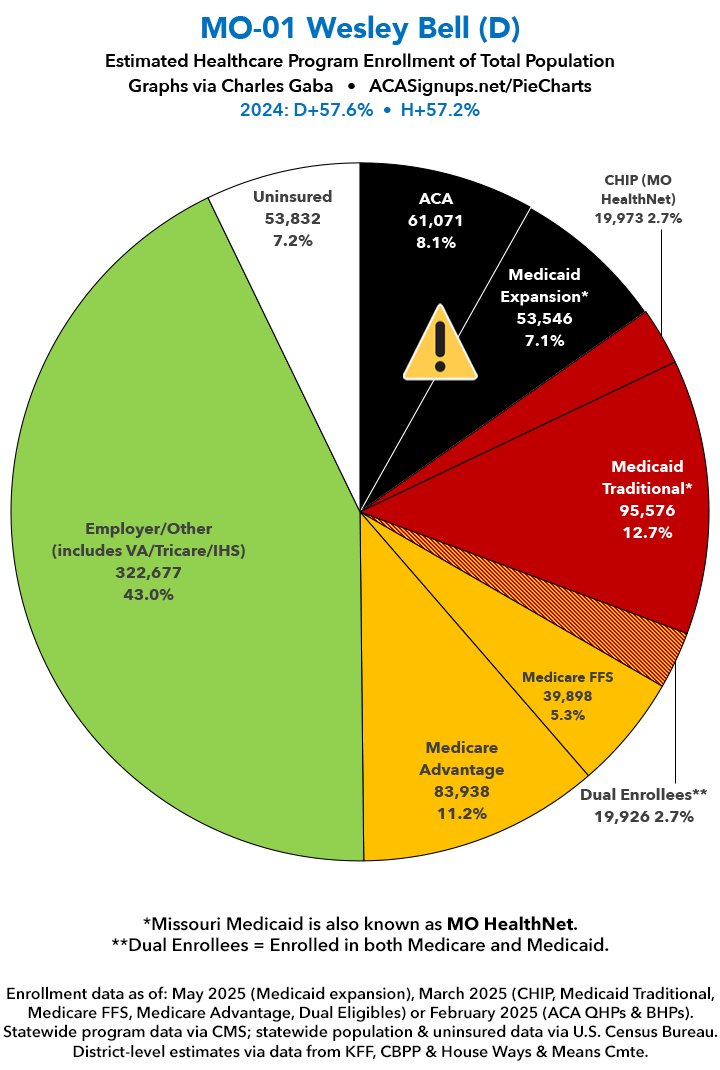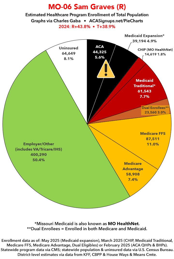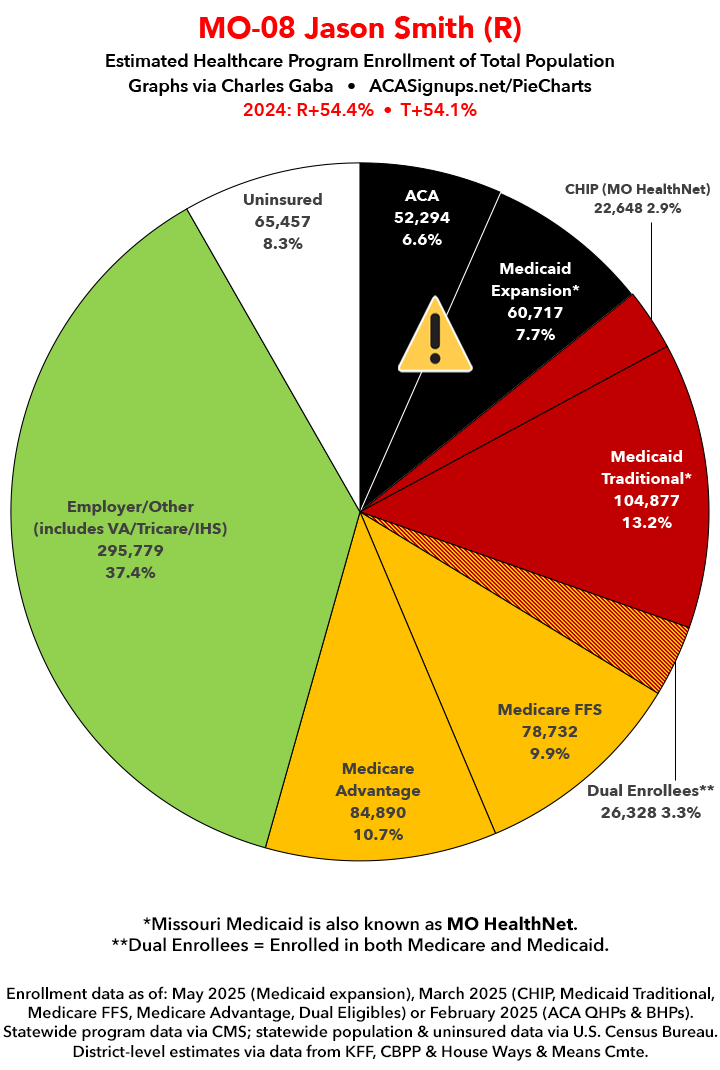 UPDATE 7/6/25: I've updated the web versions of the graphics with the most up-to-date enrollment data I have access to. The black sections w/the ⚠️ symbol are those most at risk of losing healthcare coverage due to H.R. 1, the "One Big Beautiful Bill Act" (aka the #MAGAMurderBill).