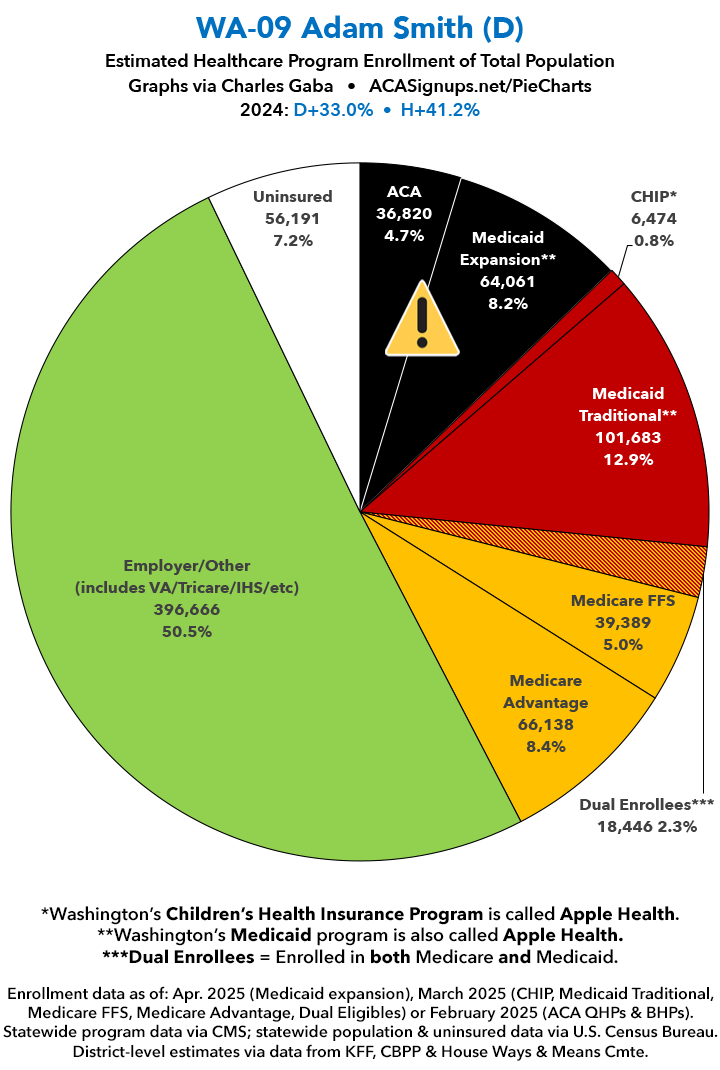 UPDATE 7/15/25: I've updated the web versions of the graphics with the most up-to-date enrollment data I have access to. The black sections w/the ⚠️ symbol are those most at risk of losing healthcare coverage due to H.R. 1, the "One Big Beautiful Bill Act" (aka the #MAGAMurderBill).