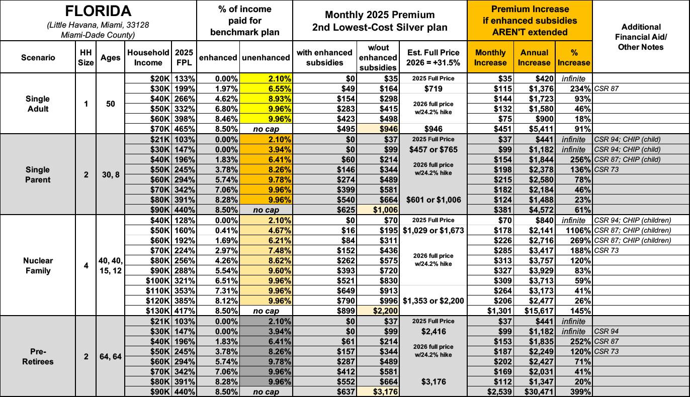 NEW: The original version of this analysis included a 4.3% increase in the unsubsidized benchmark plan premium based on a projection by the Congressional Budget Office. However, that was a national average projection which didn’t take into account other factors like increased utilization, medical inflation and so on. This updated version assumes the actual 2026 Florida rate filings which average 24.2% statewide.