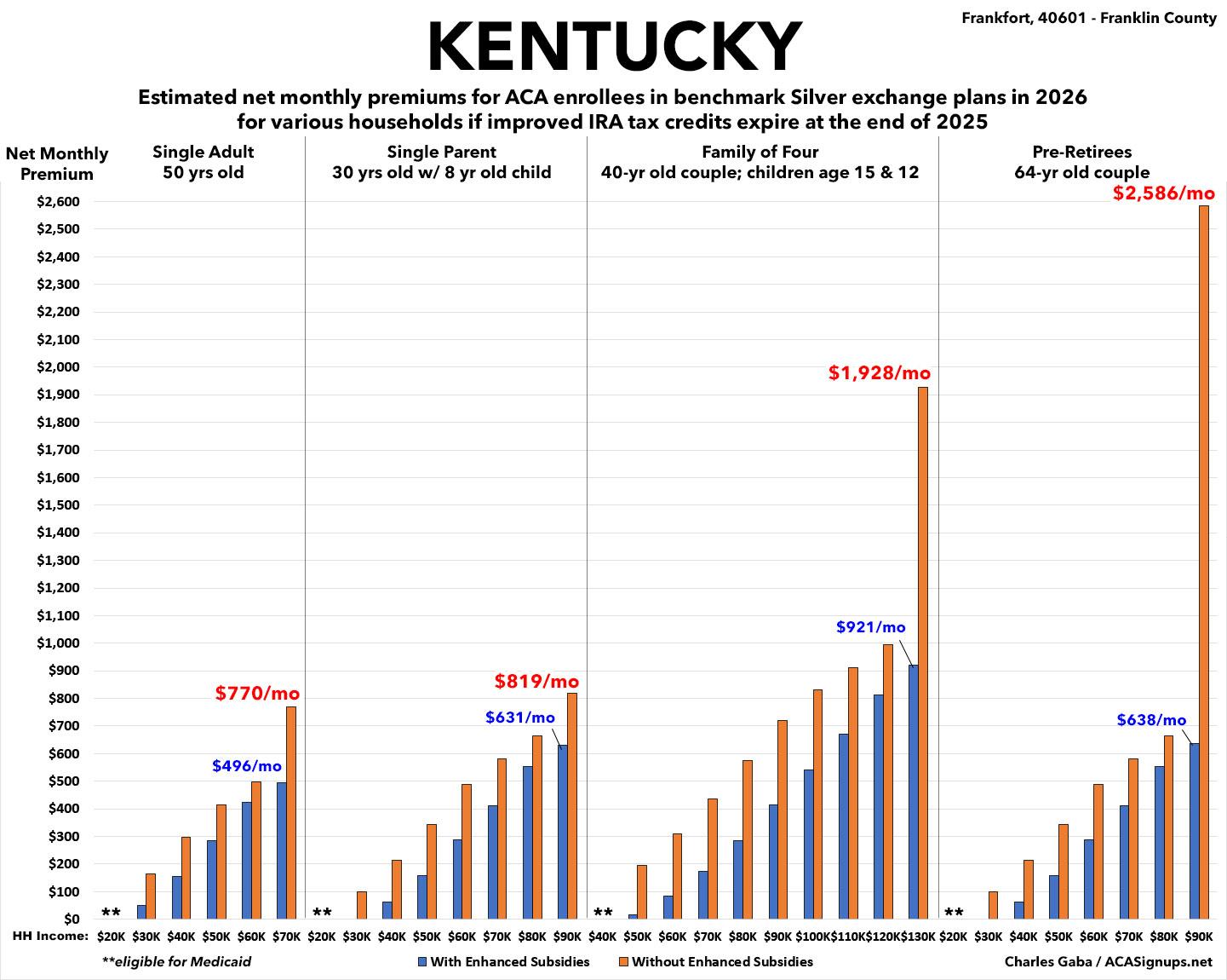 Kentucky has around 97,000 residents enrolled in ACA exchange plans, 86% of whom are currently subsidized. I estimate they also have another ~6,800 unsubsidized off-exchange enrollees.