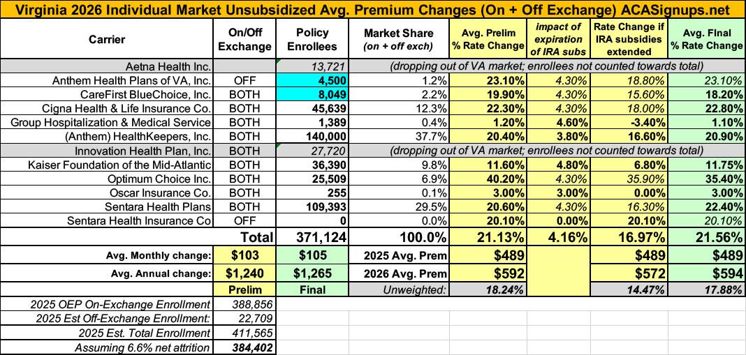 The original version of this analysis included a 4.3% increase in the unsubsidized benchmark plan premium based on a projection by the Congressional Budget Office. However, that was a national average projection which didn’t take into account other factors like increased utilization, medical inflation and so on. This updated version assumes the actual 2026 Virginia rate filings.