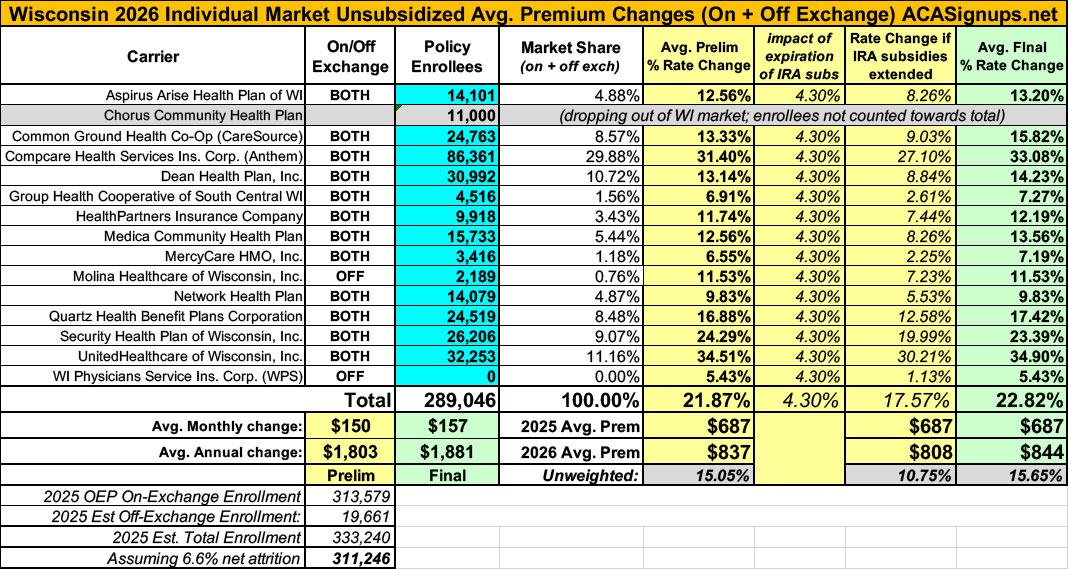 Wisconsin has around ~293,000 residents enrolled in ACA exchange plans, 98% of whom are currently subsidized. I estimate they also have another ~19,000 unsubsidized off-exchange enrollees.